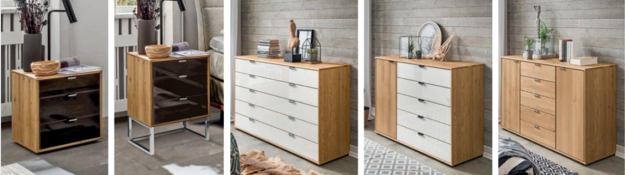 Doplňkový nábytek CARDIFF zahrnuje komody, noční stolky a lavice k toaletním stolům, vždy sladěné s dekorem a barevností skříní, aby celkový vzhled ložnice působil harmonicky. Volitelně lze zvolit klasickou kluznou podnož nebo moderní pojezdové lišty. Noční stolky lze doplnit o horní panely a LED osvětlení pro elegantní finální vzhled.