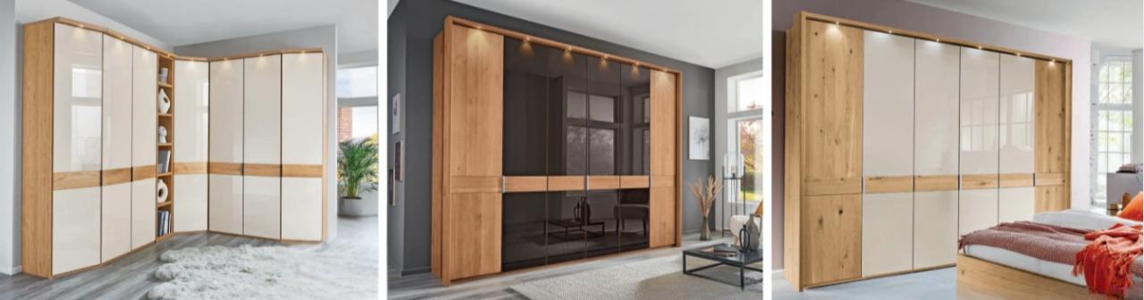 Skříně CARDIFF jsou k dispozici jak s posuvnými, tak s otevíracími dveřmi, a nabízejí široké možnosti konfigurace. Různé šířky a výšky lze kombinovat s předními plochami z masivního dřeva, skla nebo zrcadla. K dispozici jsou úchyty v chromu nebo antracitově šedé barvě, které podtrhují kvalitní provedení.