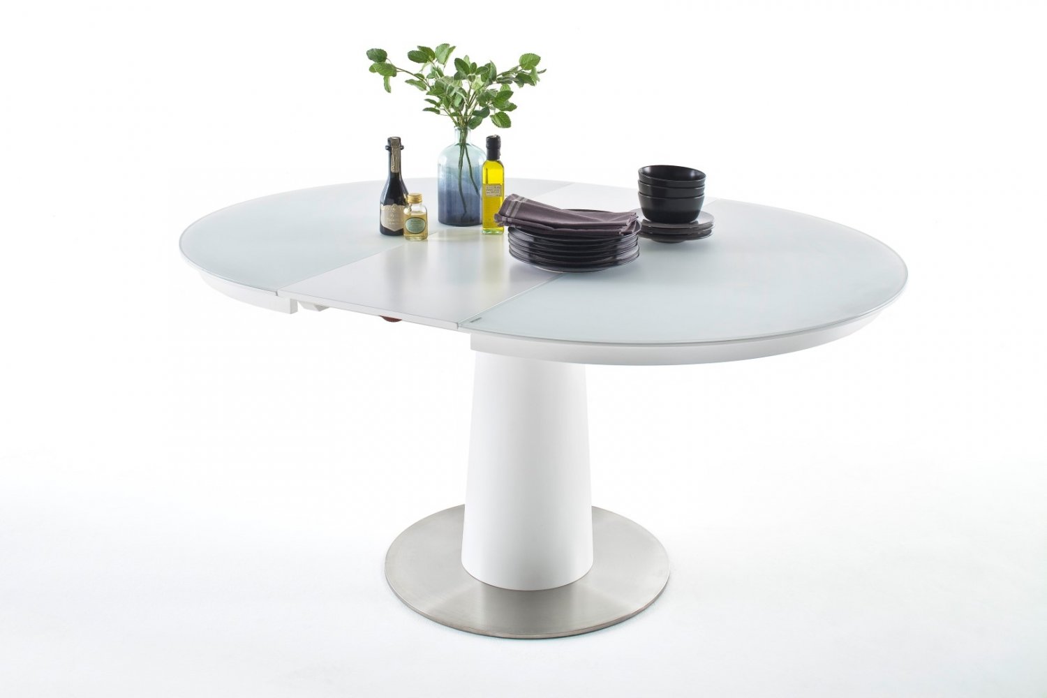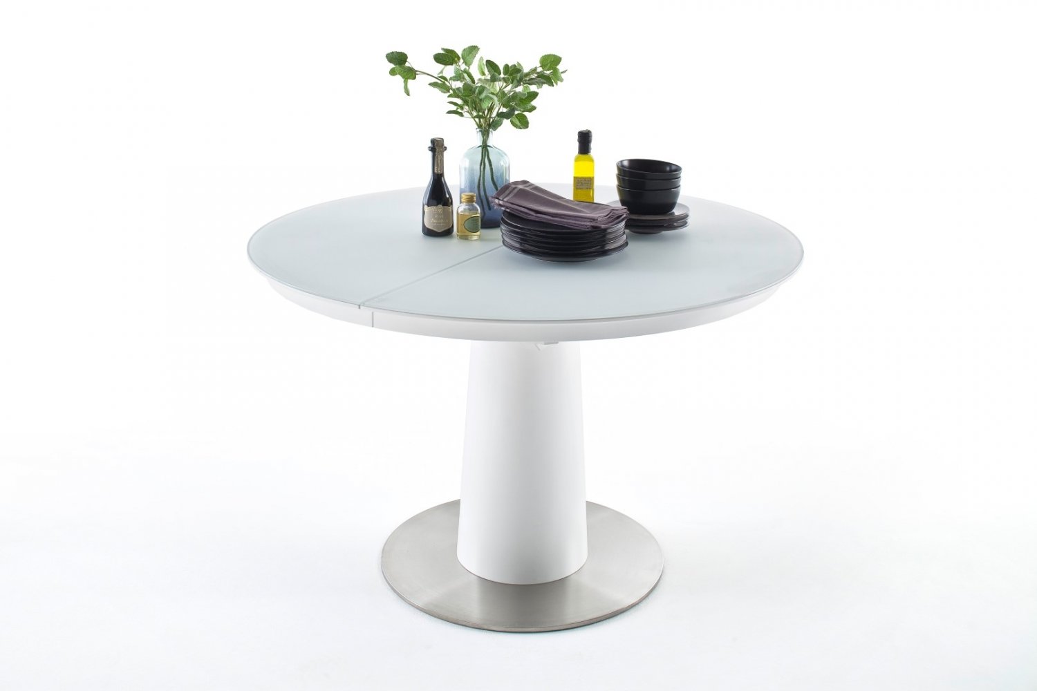 Jídelní stůl Waris nabízíme se středovou MDF lakovanou matnou nohou a nerezovou podstavou a skleněným kulatým plátem stolu, který se dá roztáhnout!