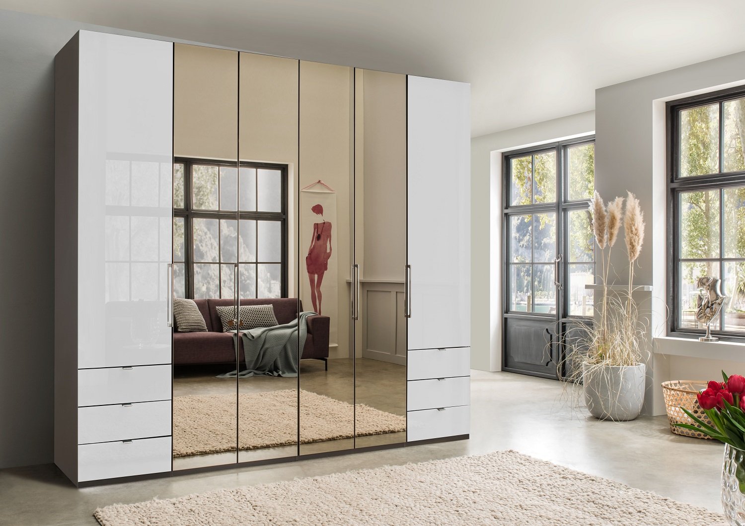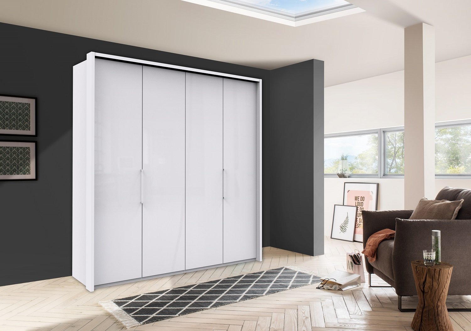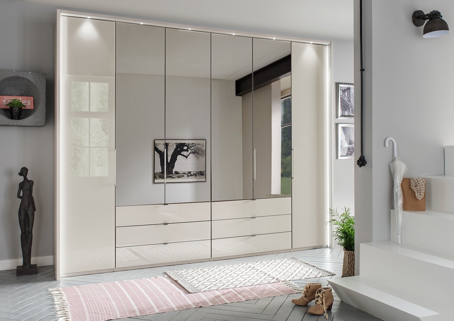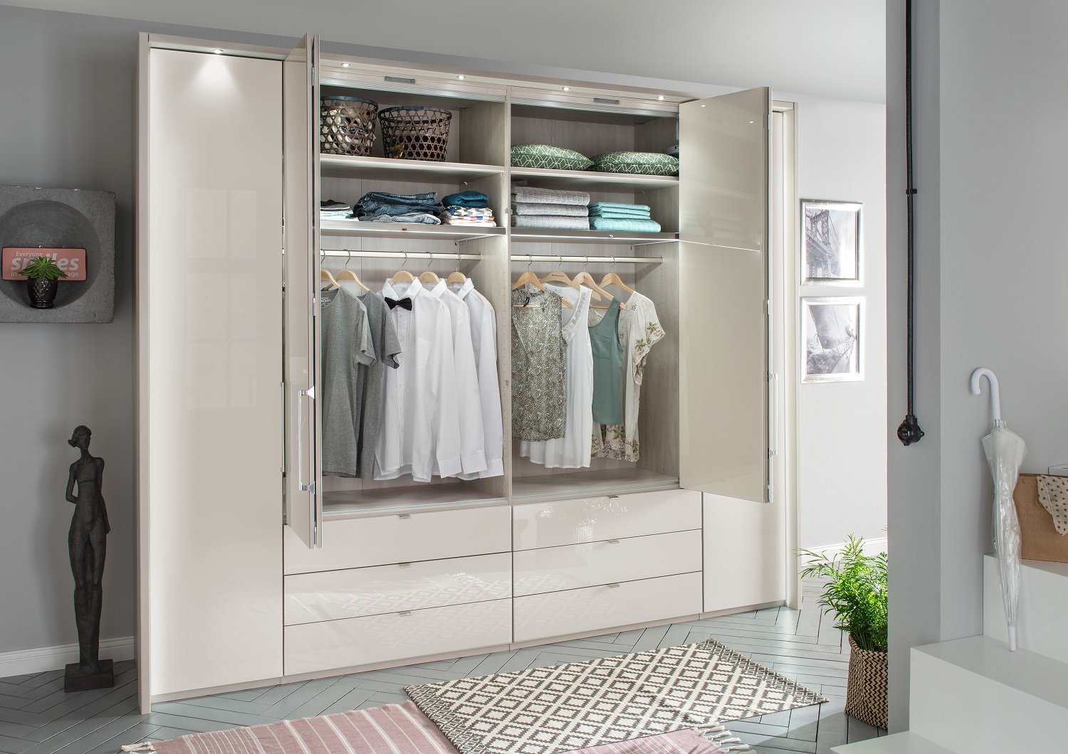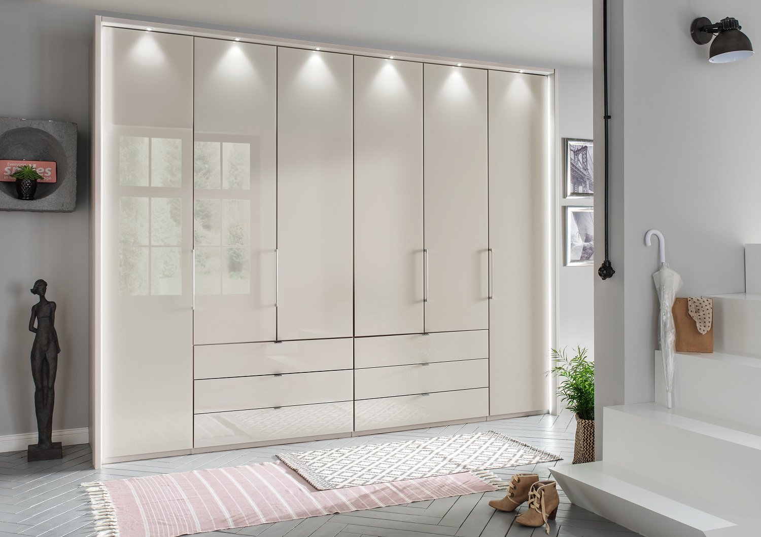 Originální šatní skříň s dvojitými dveřmi je možné zhotovit buď v celé její délce, nebo v kombinaci s centrálními a bočními zásuvkami a to ve dvou výškých 216 nebo 236 cm. Vybrané dveře je možné osadit zrcadly. Pro naprostý komfort lze skládací dveře vybavit systémem automatického otevírání nebo také bodovým LED osvětlením či světelným rámem.