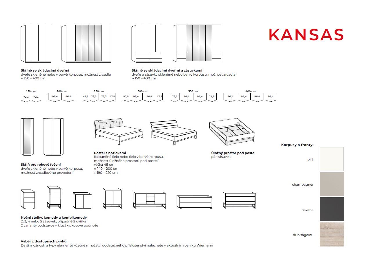 Luxusní ložnicová sestava Kansas na první pohled zaujme elegantním a vzdušným designem, který oživí každý moderní interiér. K výrobě bylo použito vysoce kvalitní lamino v příjemném odstínu bílá champagne, které vkusně doplňují lesklé plochy s tvrzeného skla ve stejném odstínu. Elegantní design nábytku podtrhují chromované rukojeti a nohy. Na výběr máte z několik druhů skříní v různých velikostech, komody, postele ve standardních i prodloužených variantách a noční stolky.
