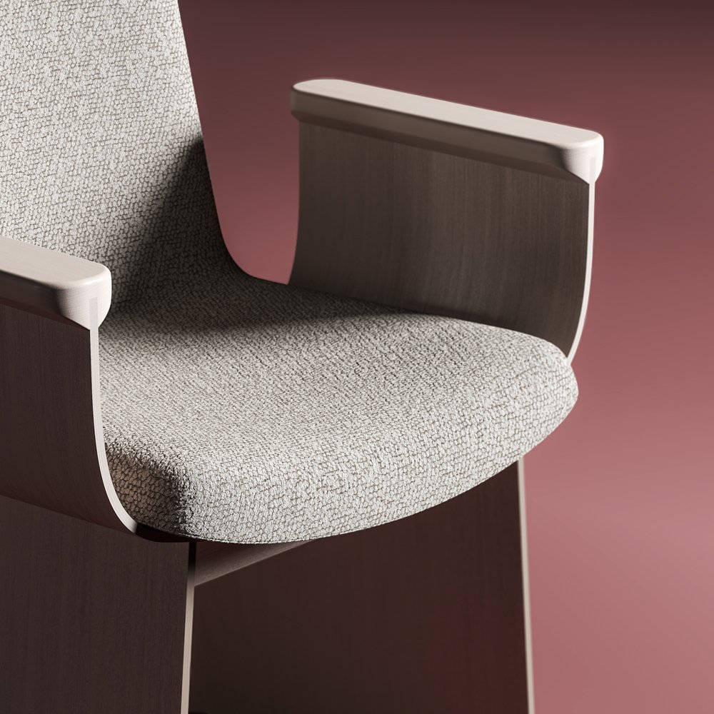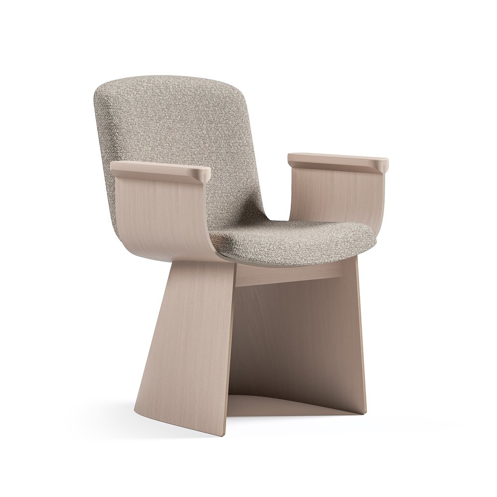 Lamella židli tvoří dva organicky tvarované pláty překližky. Jeden překližkový díl tvoří čalouněný sedák i opěrný díl, zatímco druhý díl vytváří náruč pro jeho usazení. Područky jsou doplněny a zvýrazněny frézovaným dílem z masivního dřeva, jež tvoří výrazný, plně funkční a příjemný detail kolekce.