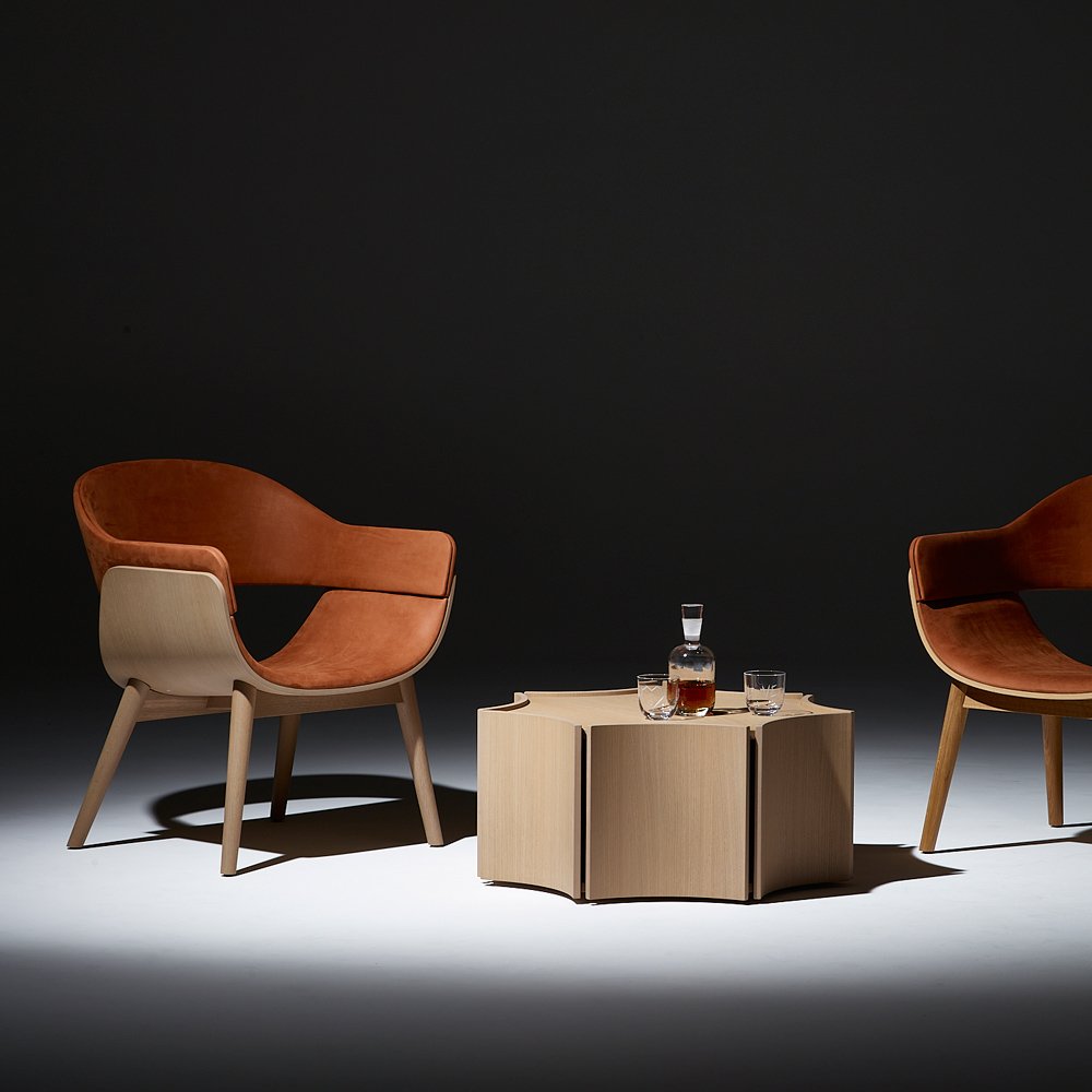 Jemné křivky potkávajících se ploch se slévají v kompaktní a odolný celek, který byl navržen s ohledem na zátěž provozu hospitality. Design zvýrazňuje půvab a ladné tvarování překližkových lamel a vyrůstá z výrobního know-how firmy. Křeslo Rendezvous C je celočalouněná varianta.