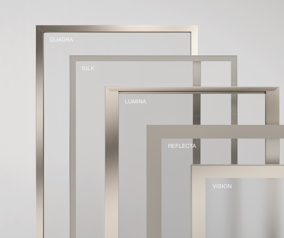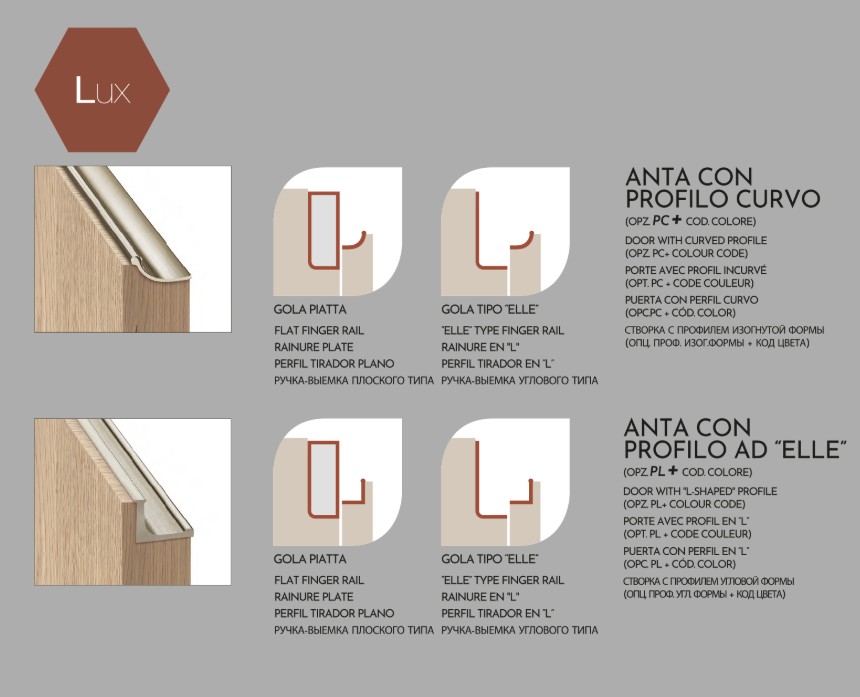 • Clover LUX - Tento systém má stejný princip jako varianta NECK. Navíc je však zdokonalena profily, které jsou zafrézovány do hrany dvířek. Nabízí tak ještě praktičtější otevírání dveří, samozřejmostí je výběr tvaru a povrchového dokončení profilu.