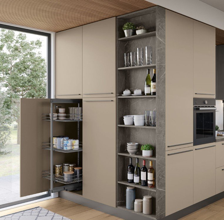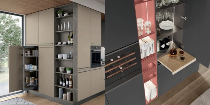 Vysoká skříň s výsuvným košem – výsuvné vnitřní doplňky pro sloupce z katalogu „Inside-K“ a nový otevřený koncový prvek „Row“, dostupné v různých barvách.
