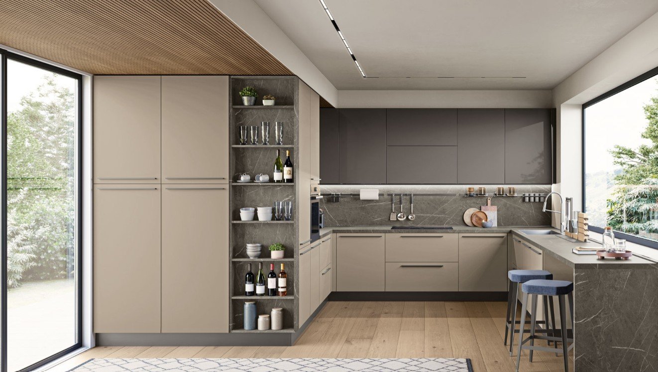 Systém otevírání Neck. Nová modulace Neck se 1 až 3 drážkami pro spodní skříňky a koncové prvky, dostupná také s dveřmi Rain.