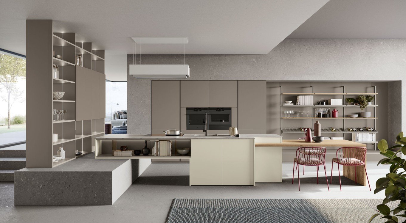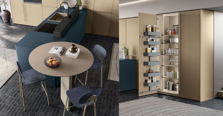 Kuchyňský ostrov s kulatou pracovní deskou a kulatým snack stolem. Nové zakřivené prvky, jako zaoblený bok ostrova, poloostrov „Flare“ a doplňkové nohy „Gatsby“, dodávají kuchyni dynamiku a harmonii.