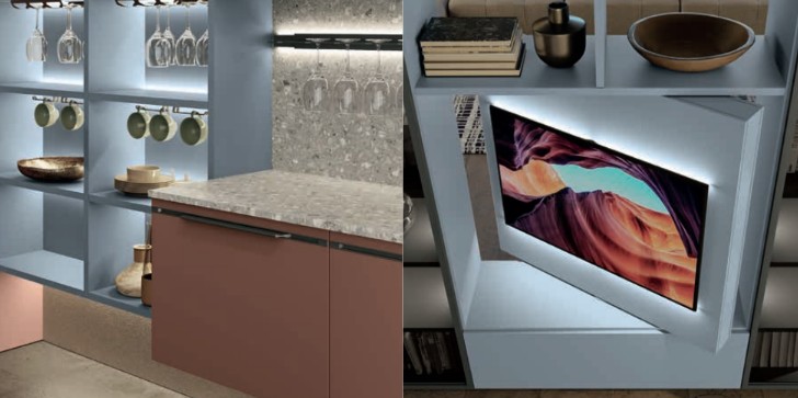 Výsuvný podnos a otevřené prvky s LED osvětlením – výsuvný podnos „Slicer Box“ vkládatelný do spodních skříněk a sloupců a nový otevřený sloupec „Look“ s šuplíky a LED osvětlením po bocích.