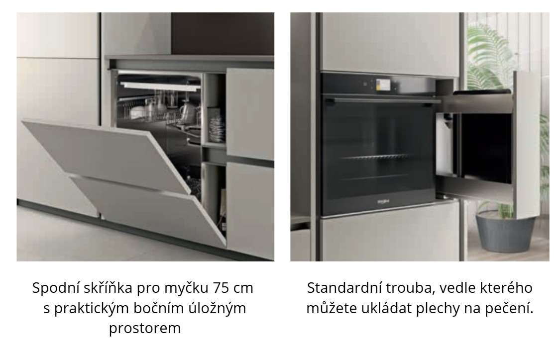 možnost využití širokých 75cm modulů pro spodní i horní skříňky i pro spotřebiče, jako jsou chladničky, mrazničky, trouby a myčky.
