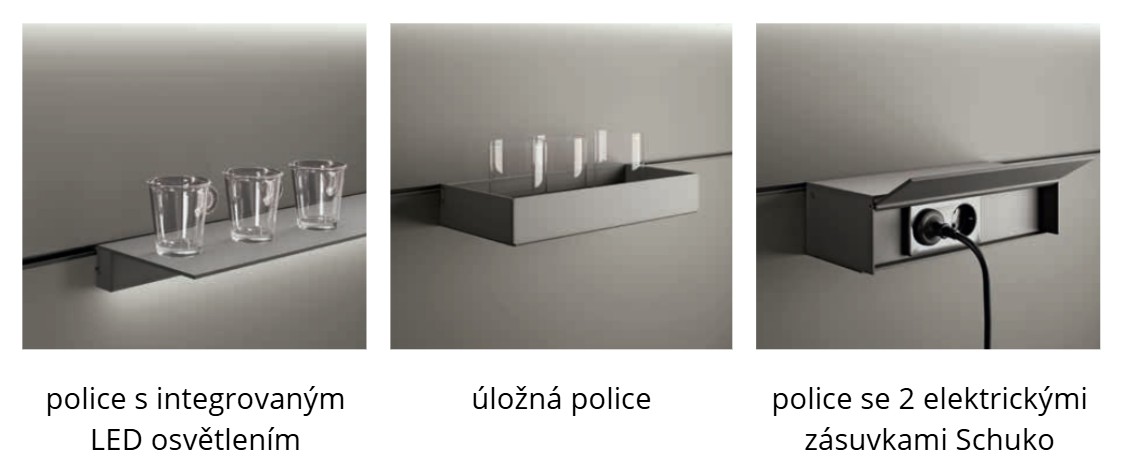 otevřené prvky pro spodní a horní skříňky se středovými policemi doplněnými LED osvětlením,
