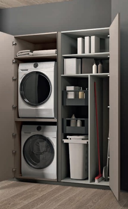 Modul prádelna – o šířce a hloubce 75 cm, umožňuje umístit pračku a sušičku nad sebe spolu s dalším úložným prostorem, vybaveným praktickými výsuvnými koši.