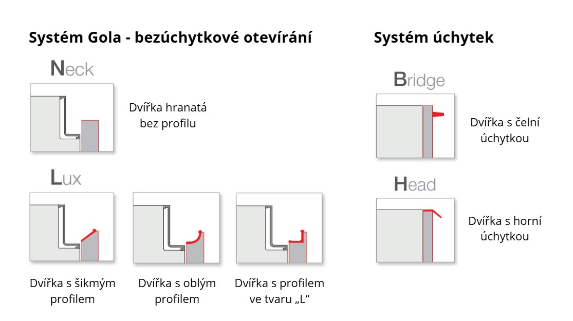 Immagina LUX - Tento systém má stejný princip jako varianta NECK. Navíc je však zdokonalena profily, které jsou zafrézovány do hrany dvířek. Nabízí tak ještě praktičtější otevírání dveří, samozřejmostí je výběr tvaru a povrchového dokončení profilu.