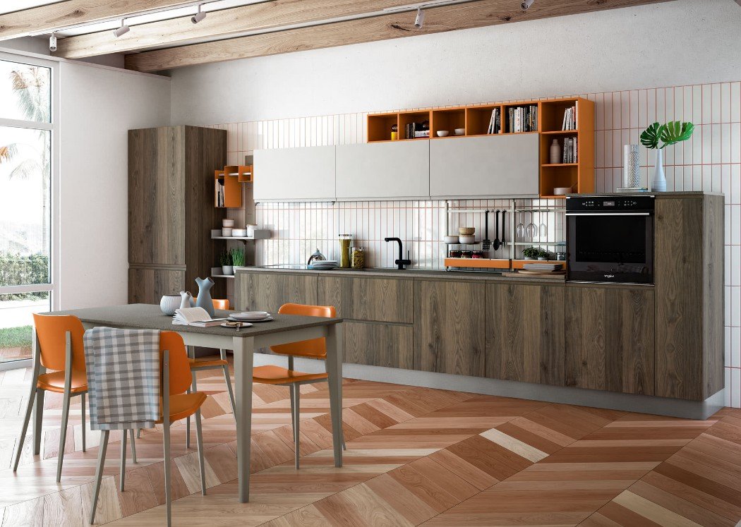 Inovativní řešení kuchyňské linky, jejíž dvířko má integrovanou úchytku, což umožní vytvoření krásné a elegantní kuchyňské linky bez úchytek. Provedení v přirozených moderních dekorech dřeva v kombinaci s jemnými barvami s jemným detailem dřevěné hrany zajišťuje nadčasovost, eleganci a moderní italský design kuchyňské linky. Italská designová kuchyně Jey nabízí širokou škálu řešení kuchyně na míru.