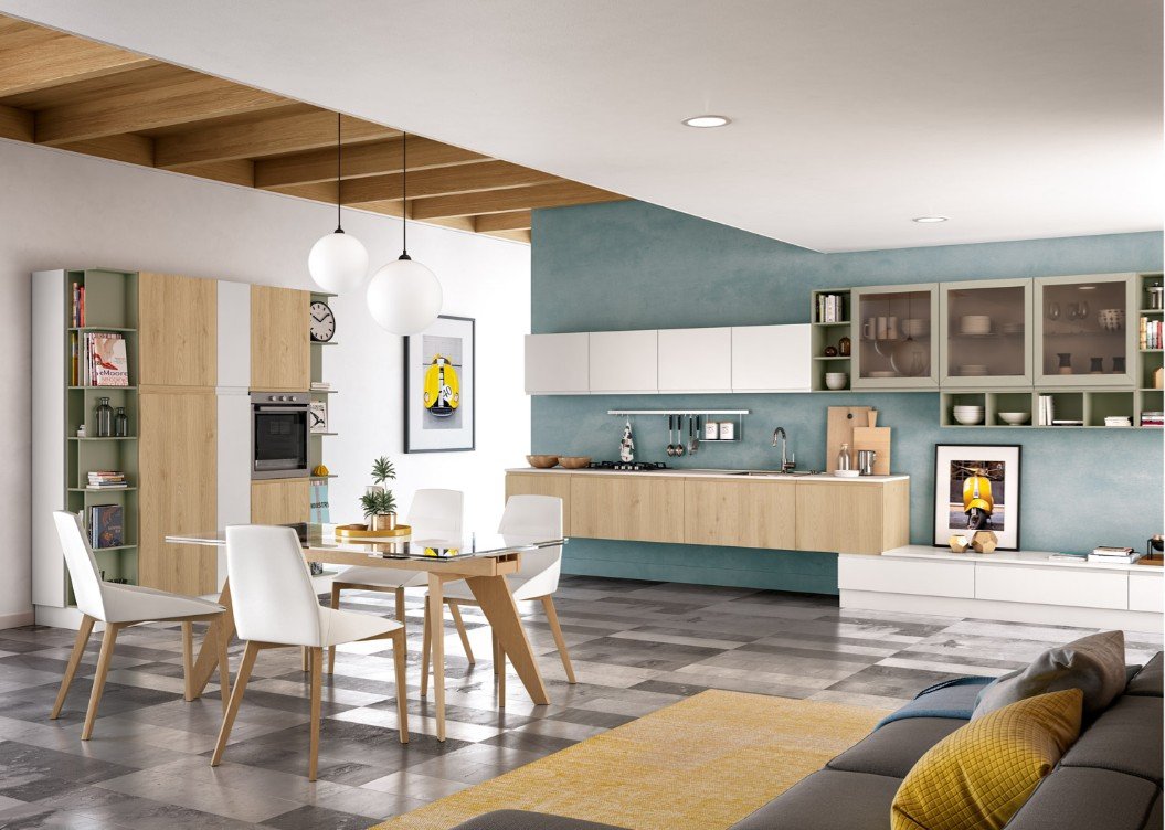 Model Jey Feel se přirozeně otevírá do obývacího prostoru, čímž vzniká jednotné a harmonické prostředí pro vaření, stolování i odpočinek. Díky otevřeným modulům, závěsným skříňkám a promyšlenému uspořádání vysokých a nízkých prvků vzniká dynamická kompozice, která propojuje kuchyň a living a dodává celému prostoru lehkost, eleganci a pohodlí.
