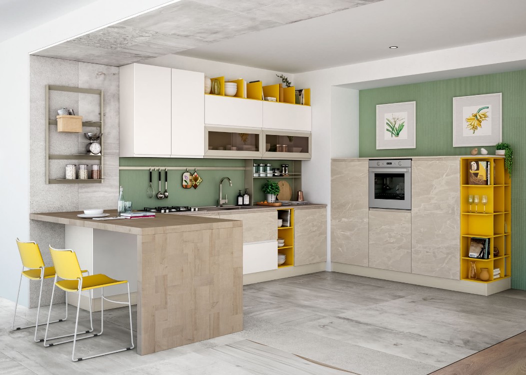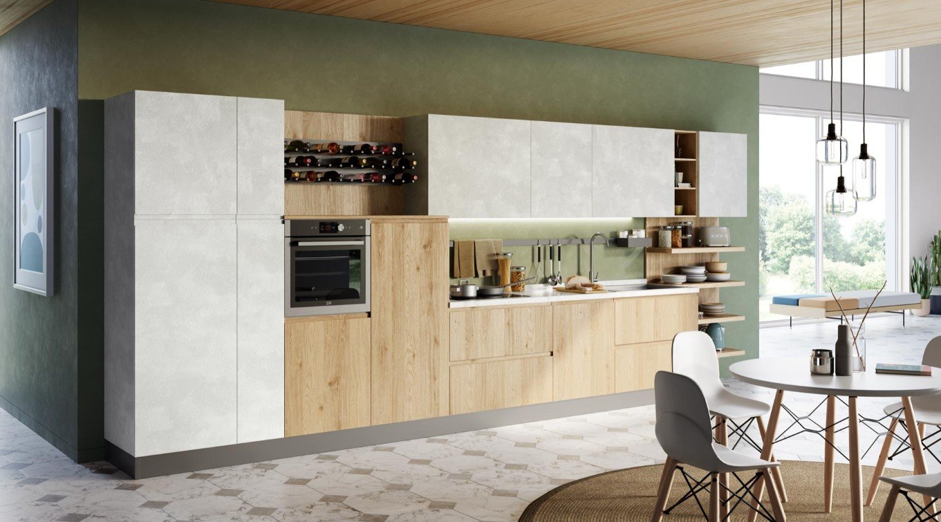 Zvýrazňuje a individualizuje každý interiér díky kombinacím materiálových dekorů dřeva, povrchů s efektem kamene a matného mramoru, které lze uplatnit na spodních skříňkách, vysokých sestavách i pracovních deskách. Široká škála povrchů a detailů činí kuchyni výjimečnou z každého pohledu.