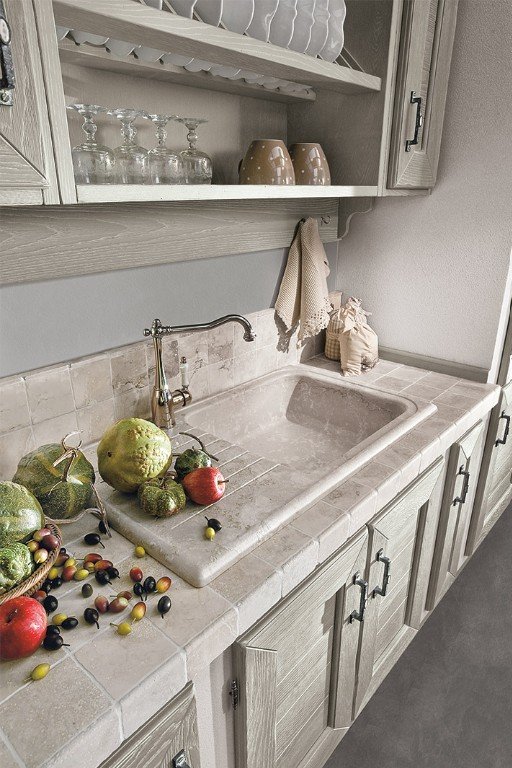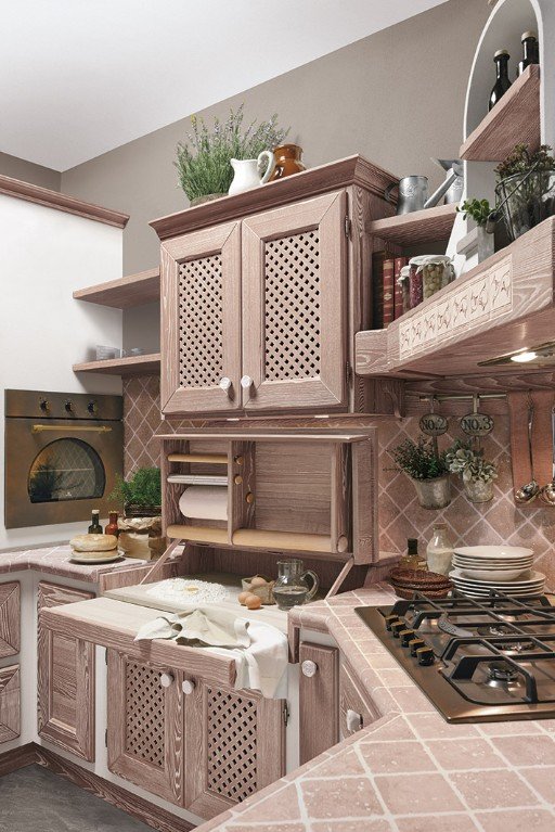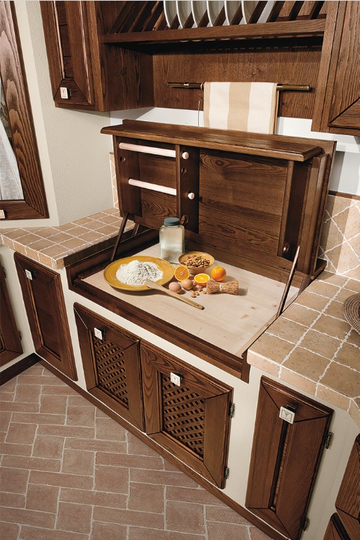 Luisa nabízí všechna řešení, která usnadní každodenní život v kuchyni. Výsuvné pracovní desky a snadno dostupné úložné prostory na kuchyňské náčiní zajišťují maximální praktičnost a pohodlí při jakékoli činnosti. Celkový dojem dotvářejí elegantní knoflíky Borgo Antico, ručně zdobené různými motivy a barvami, které proměňují každá dvířka v originální detail a přinášejí do kuchyně kouzlo tradiční řemeslné práce.
