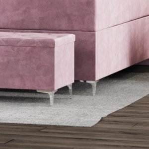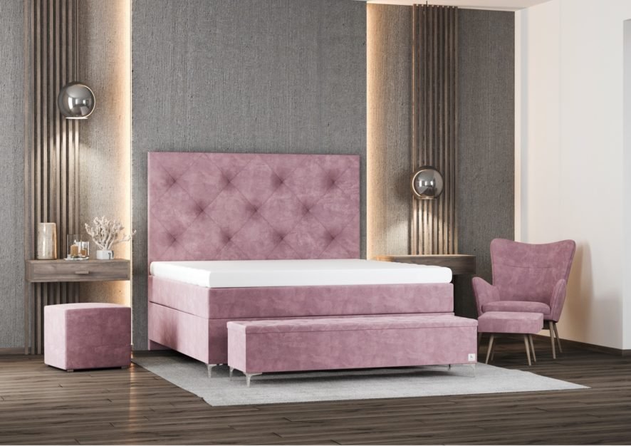Dominantním prvkem čela jsou kosočtverce jemně spojeny elegantním švem, který dotváří celkový exkluzivní vzhled postele. Při doplňkovém osvětlení je přirozená plasticita čela ještě umocněna neopakovatelnou hrou stínů. Čelo je vhodně doplněno elegantními nerezovými nožičkami, které navozují pocit lehkosti a vzdušnosti. Postel ELEANOR celkově působí velmi ladně a vyváženě.