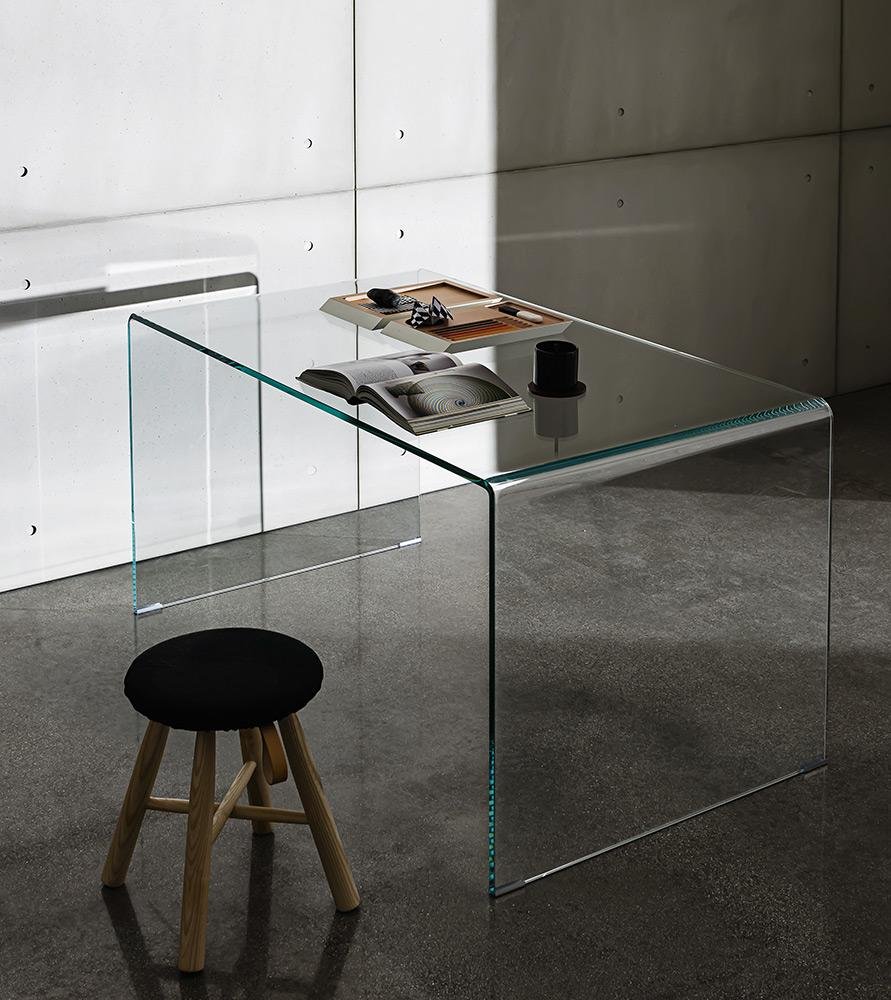 Jídelní / psací stůl z ohýbaného čirého extra čirého skla nebo lakovaného v jedné či dvou barvách, v různých barevných provedeních.