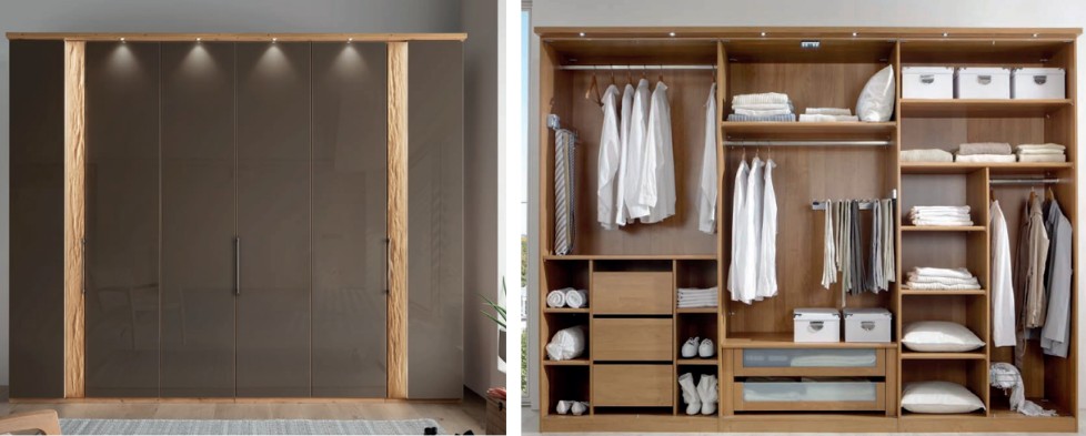 Všechny typy skříní lze doplnit o passepartout rámy a korunní lišty, volitelně s LED osvětlením, které podtrhne půvab polomasivního dřeva a skleněných ploch. Propracované vnitřní vybavení umožňuje dokonalou organizaci oděvů a doplňků.