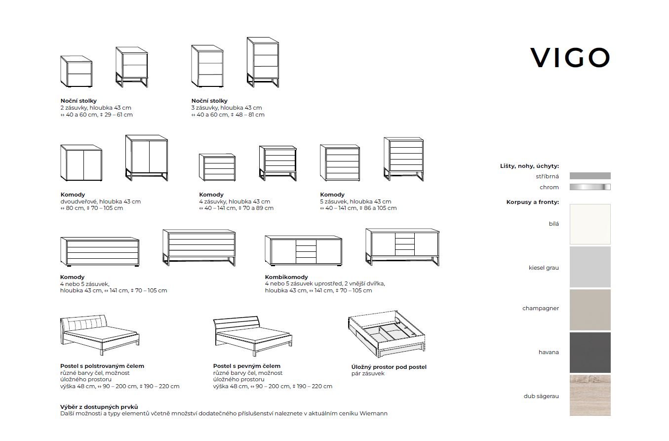 Ať už v ložnici nebo kdekoli jinde v domácnosti – všestranné komody série Vigo splní všechny vaše potřeby. Nabízejí stylový úložný prostor a lze je přizpůsobit jakémukoli stylu interiéru. Ale ani ložnice by neměla být zanedbávána. Zde rozmanité postele s velkými zásuvkami nabízejí dostatek úložného prostoru. Staňte se svým vlastním interiérovým designérem a navrhněte si svůj domov podle svých představ s touto flexibilní řadou.
