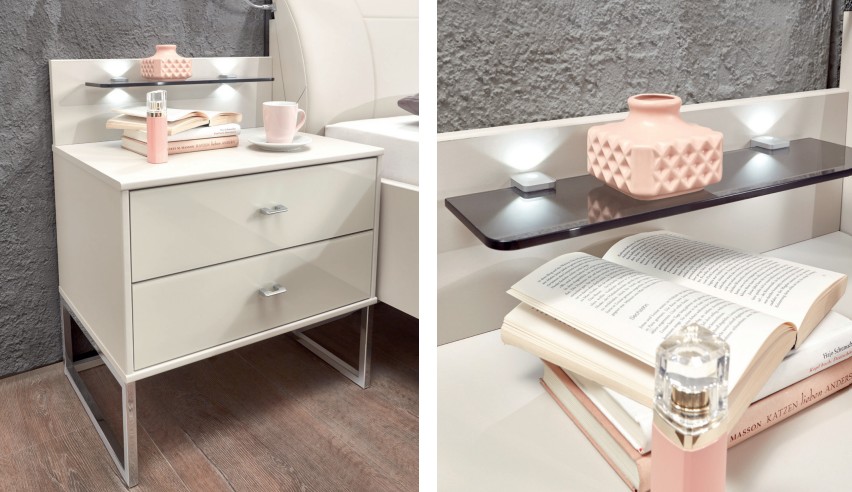 Zajímavým detailem je možnost doplnit některé kusy o LED podsvícení, například horní desky nočních stolků se vsazeným podkladem z kouřového skla. Jemné světlo vytváří příjemnou a útulnou atmosféru, ideální pro večerní odpočinek.